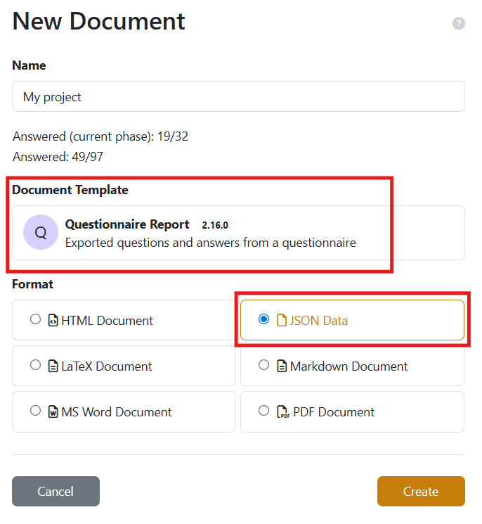 First, the answers need to be exported in JSON format. In the Documents tab, create a new document, select the Questionnaire Report template, and choose the JSON data format.