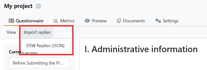 To upload the answers, first create a new project and then import the saved JSON file.